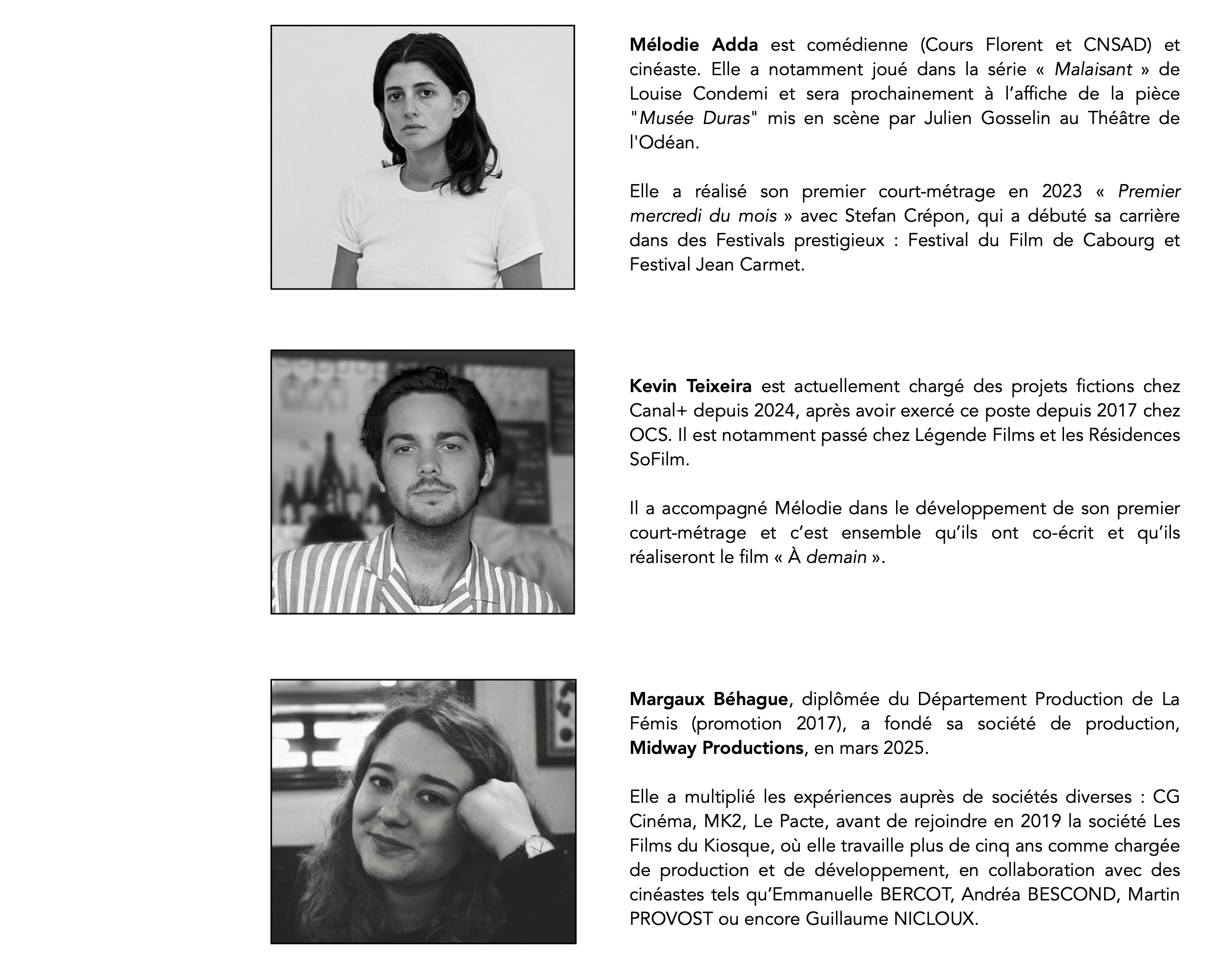 "À demain" est un court-métrage réalisé par Mélodie ADDA et Kevin TEIXEIRA et produit par Margaux BÉHAGUE (Midway Productions).
