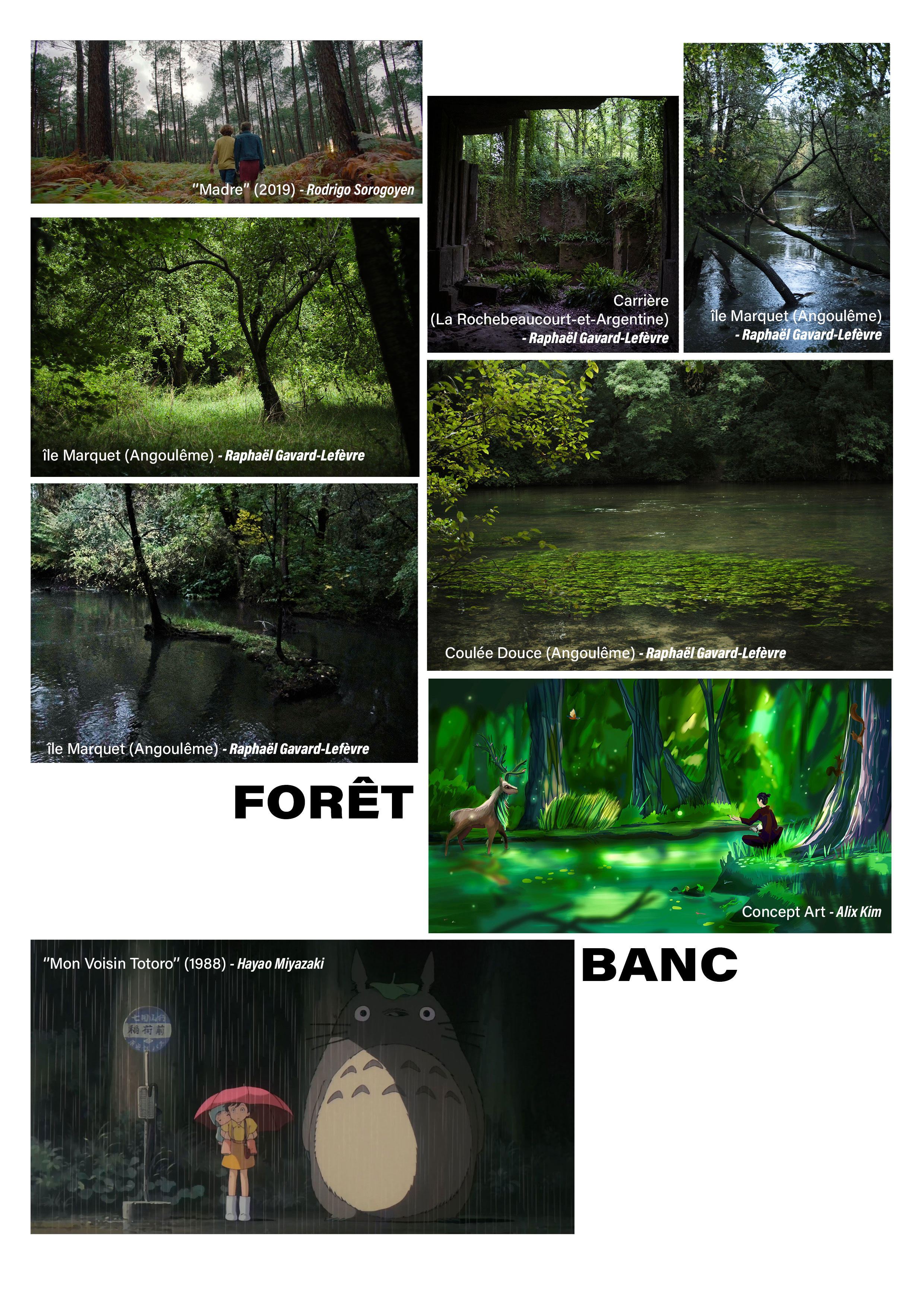 Cette volonté de vouloir créer des “tableaux” implique donc un gros travail de composition des cadres et se rapprocher d’une esthétique grand angulaire comme celle du film « Madre » (2020, racontant l’histoire d’une mère hantée par la disparition de son fils 10 ans auparavant et qui revoit dans un vacancier le fantôme de ce fils perdu) de Rodrigo Sorogoyen. La volonté du court-métrage est d’explorer lui-même ce qui est enfoui plastiquement et symboliquement dans les lieux qu’il explorera (forêt, plage, maison, aquarium, parc, etc) en s’appuyant sur l'ANIMATION notamment.