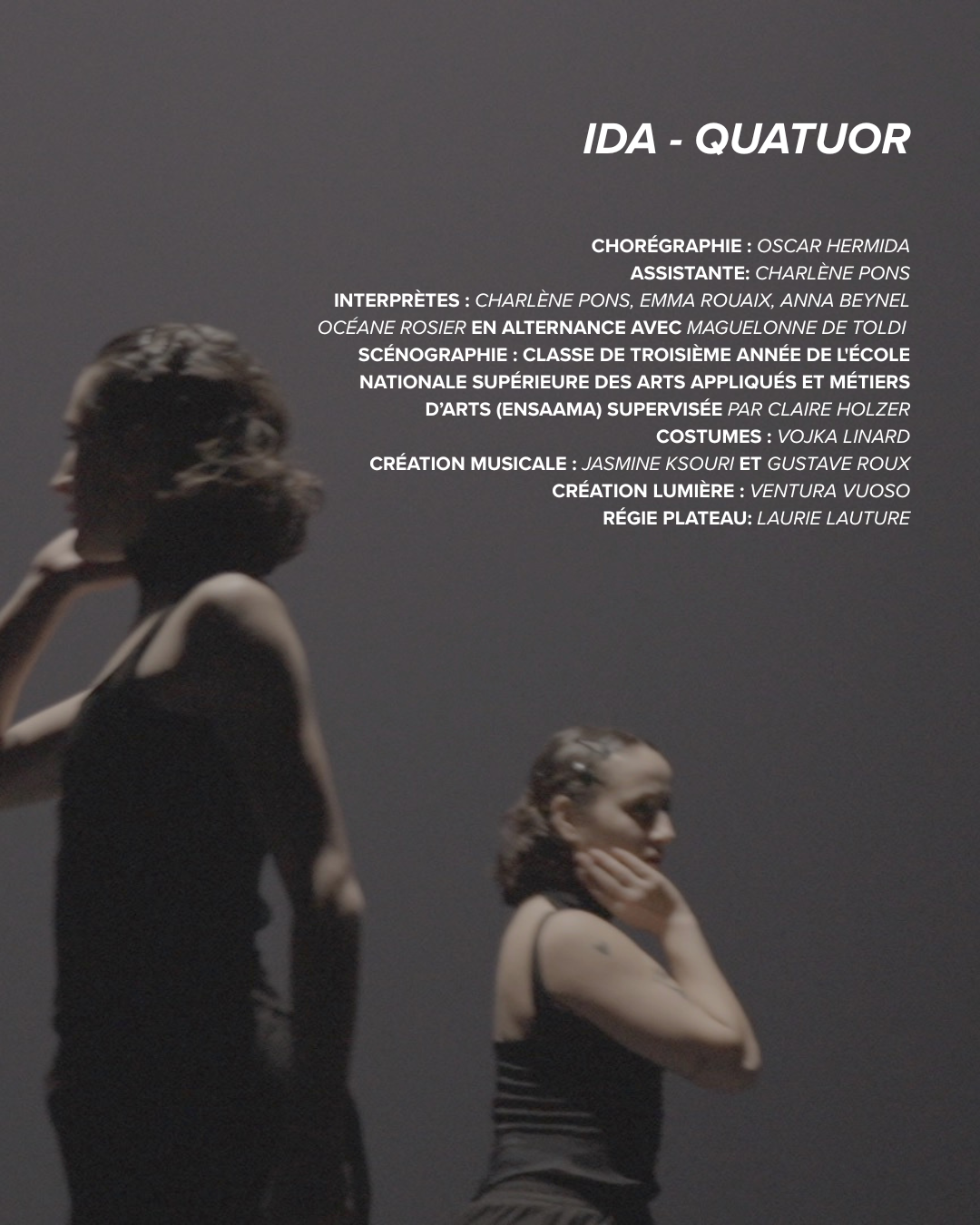 Sur scène, quatre interprètes incarnent une mosaïque d’Identités d’Ida, tour à tour fragiles et flamboyantes. La chorégraphie s’articule autour d’un lustre monumental, conçu en partenariat avec l’École nationale supérieure des arts appliqués et métiers d’arts (ENSAAMA), sous la supervision de Claire Holzer.