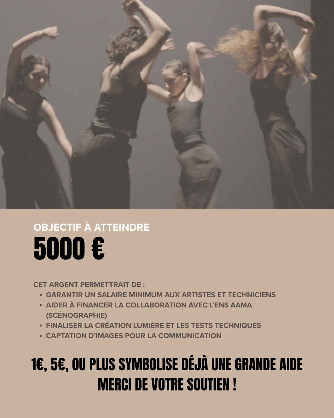 Cet argent permettrai de garantir un salaire minimum à tous les artistes et techniciens impliqués. Aussi, il permettrai de financer l'achat des matériaux de la scénographie en partenariat avec l'École nationale supérieure des arts appliqués et métiers d’arts (ENSAAMA) supervisée par Claire Holzer. La conception et la production résultent d'un partenariat avec l'ENSAAMA et ne nécessitent donc pas de financement. Cependant, une partie des fonds permettra également à la compagnie d'accueillir un service civique, qui pourra suivre et participer activement au projet.