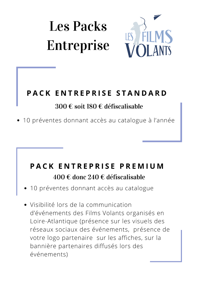 + visibilité lors de la communication d’événement des Films Volants organisés en Loire-Atlantique (présence sur les visuels des réseaux sociaux des événements,présence de votre logo partenairesur les affiches, sur la bannière partenaires diffusés lors des événements).