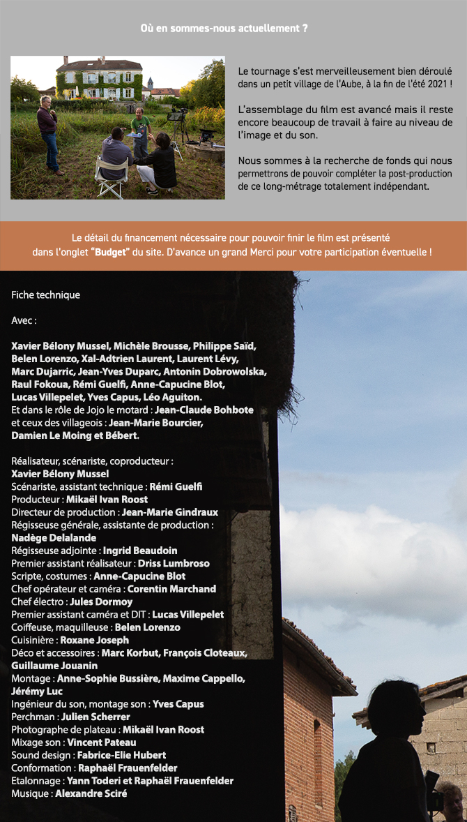 Affiche du film au format A2 + Lien de téléchargement de la B.O du film + Photos dédicacées des comédiens + T-shirt collector + Projection privée dans une salle à Paris pour vous et tous vos proches en présence du réalisateur et de l’équipe du film + Titre de Producteur associé au générique du film (non associé à des pourcentage sur recettes) + Séjour d’un week-end découverte dans un gîte à Juvanzé (village du tournage dans l’Aube) + Workshop d’un week-end: initiation au jeu d’acteur, donné par Xavier Bélony Mussel.