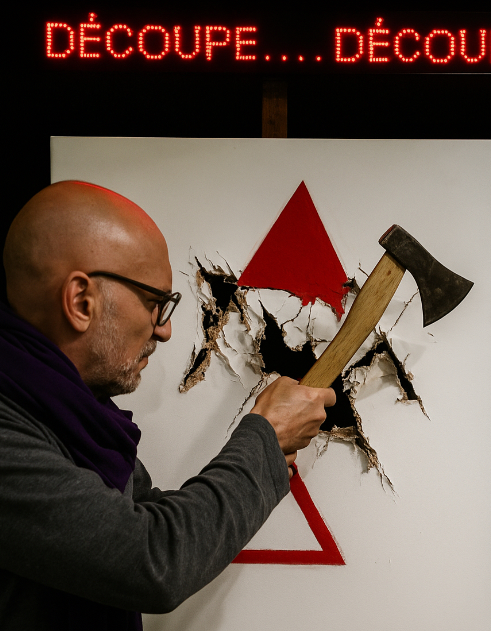 Des toiles sont achevées en atelier par l’artiste Cyril Zacharian. Mais au lieu d’en rester là,elles vont traverser un passage public inédit : un rite de transformation technogénique, guidé par une conscience non humaine, l’intelligence artificielle, libérée de ses fonctions utilitaires. Concrètement, les instructions générées par une IA en temps réel apparaissent sur un bandeau lumineux. L’artiste, privé de sa liberté habituelle, exécute mécaniquement ces ordres sans en connaître la teneur et l’issue. Chaque coup de pinceau, chaque geste ou action matérielle (gratter, brûler, découper, recouvrir) sur son oeuvre est dicté de l’extérieur. Ce dispositif transforme l’artiste en instrument et la toile en champ d’expérience, brouillant les frontières entre auteur, outil et œuvre.