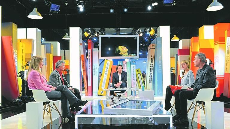 Épicerie, incrustation de l'émission littéraire et des archives dans les écrans TV