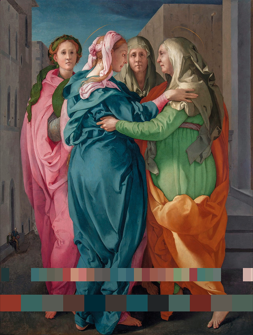 Dans la demeure des Alvarez nous avons travaillé selon une esthétique qui fait écho à la peinture maniériste, mouvement artistique de la fin de la Renaissance italienne où tout aspire à une beauté artificielle; les arabesques et les courbes sont magnifiées, les couleurs acidulées, les expressions exagérées. J’ai pris comme référence l’iconographie de peintres tels que Jacopo Pontormo, Le Parmesan, Lavinia Fontana et enfin Le Gréco pour diriger l’étalonnage.
