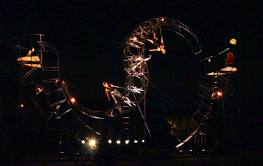 C’est ce chemin de rêveur que nous allons raconter, au travers d’acrobaties aériennes, de cascades poétiques ou de scènes burlesques… de musique électro, de gaz, de feu et de pyrotechnie.