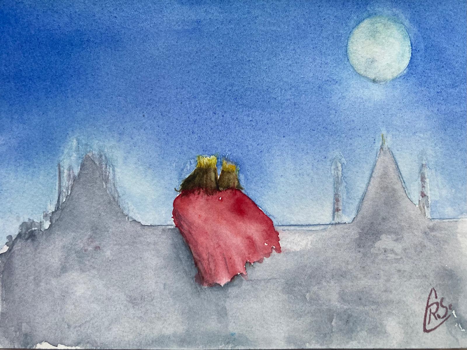 Avec son rythme saccadé de 12 i/s, l’aquarelle est légèrement tremblante et chaotique, épousant ainsi l’idée que l’on ne puisse pas tout comprendre ni tout nommer. Elle incarne la liberté que Léo recherche. Avec sa touche d’imprévisibilité, l’aquarelle donne à ressentir l’âge de Léo : à 18 ans, les sentiments sont abondants et se contredisent souvent. Il s’agit alors de se laisser prendre par ces tâches de couleurs vives, nous partageant un rapport vibrant à la vie. C’est en se protégeant des barrières limitantes de la réalité que Léo devient une chevaleresse romantique, prête à tout pour Florian : le protéger avec sa cape sur le toit d’un château, lui décrocher un bout du soleil, danser pour l’impressionner …