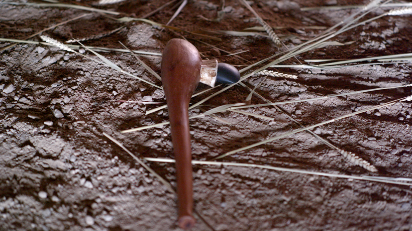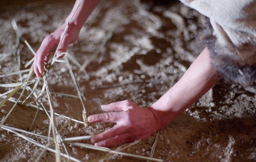 Image du film. Chaussure faite à main par la réalisatrice pour le costume de l'esprit néolithique.
