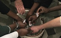 De janvier à juillet 2013, à l’initiative de Valens Kabarari, jeune artiste rwandais (cinéaste) rescapé du génocide tutsi de 1994, ainsi que d’Elise Delage, psychologue clinicienne lyonnaise, se réunit chaque mois un groupe formé de huit jeunes tutsi, tous enfants au moment du génocide, tous rescapés. Dans le cadre d’un rituel simple et efficace –tirage au sort d’un mot à partir de mots du quotidien inscrits anonymement sur des petits papiers et réunis dans un panier traditionnel rwandais, passation d’un foulard en guise de bâton de parole- , ces rescapés mettent en commun leurs souvenirs, en toute confiance, en toute liberté. La démarche de témoignage n’est pas ici prioritaire, même si elle est évidemment omniprésente : il s’agit d’abord d’être ensemble, et de se réchauffer à la parole des autres, fût-elle douloureuse.