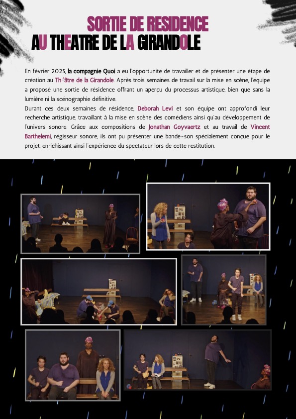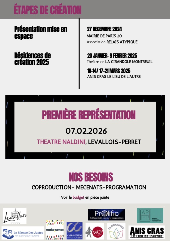 Le 7 février 2026 la Mairie de Levallois acceuillera la pièce dans sa très jolie salle du Théatre NALDINI à l'occasion d'une représentation exceptionnelle. Cette date, généreusement mise à disposition de la Compagnie QUOI, nous permettra enfin de présenter la pièce dans sa version finale, avec sa scénographie. Nous aurons la possibilité de faire une très belle création lumières avec le formudable régisseur du théâtre. Il nous faut donc lancer la construction des décors et la confection des costumes. Nous avons besoin de vous!