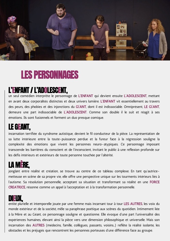 Le Géant, incarnation de l'autisme, évolue en symbiose avec l'enfant, exprimant ses émotions et ses défis, tandis que l'Ombre d'un père, s'efface progressivement de leur vie. Les Autres, voix off du monde extérieur, incarnées au plateau par « Dieux » personnages hors de temps et de l’espace, apportent une dimension universelle à l'expérience particulière, soulignant la quête de sens face aux épreuves tout en soulignant l'altérité et l'incompréhension de la société face à la différence.