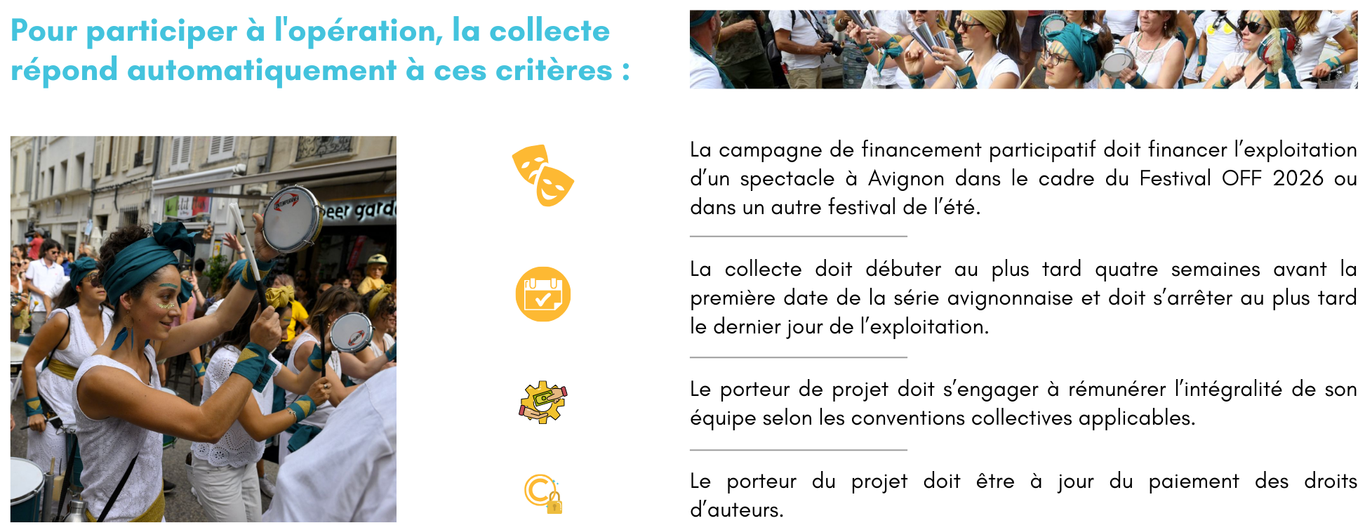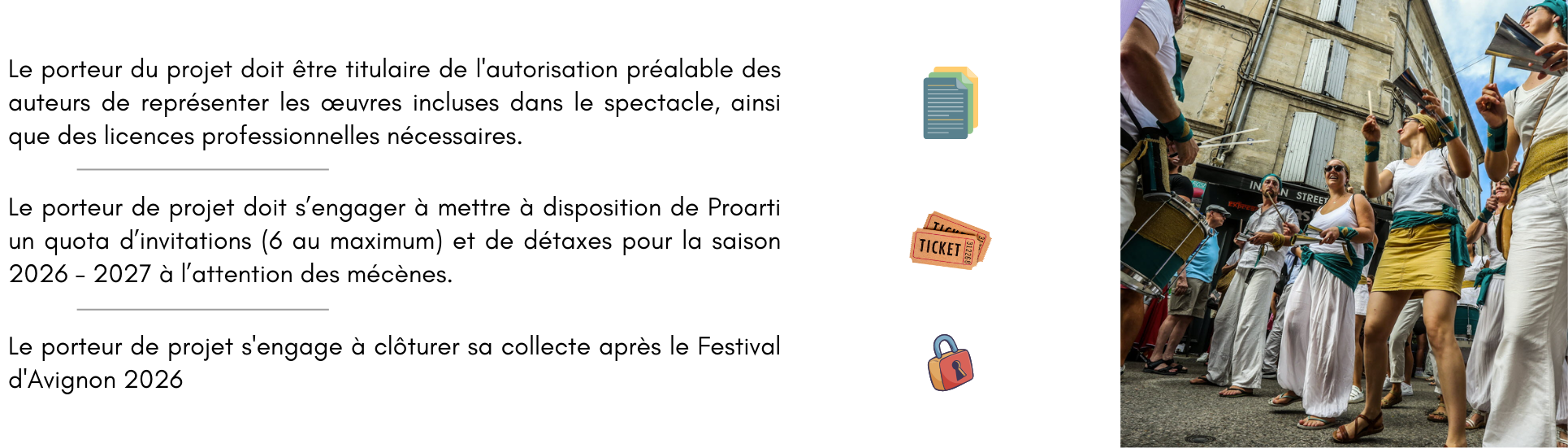 Si ces 2 derniers critères ne peuvent être remplis, la collecte pourra tout de même être lancée au sein de l'opération Mission Avignon 2026 mais ne bénéficiera pas du don coup de pouce.